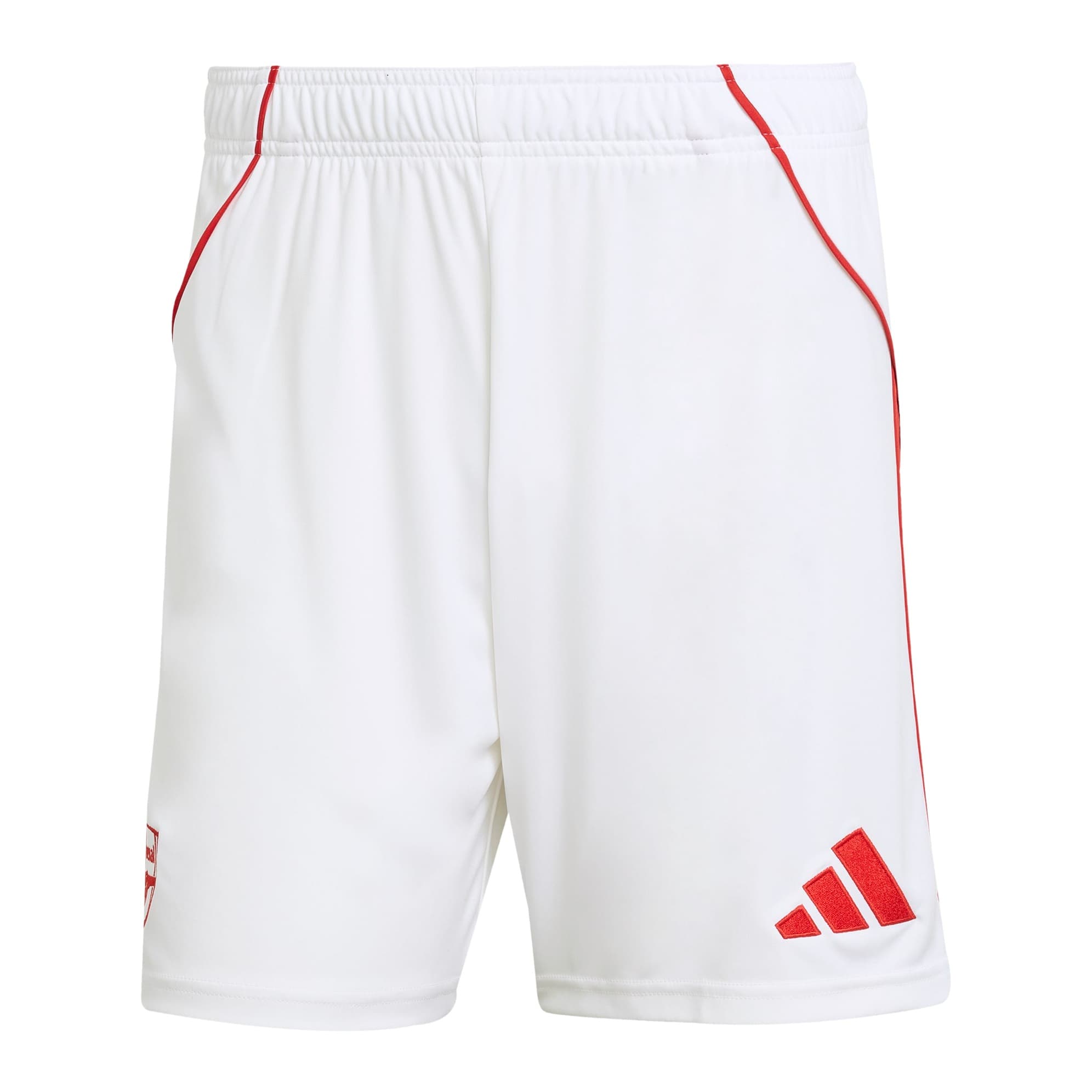 ARSENAL HOME SHORTS 2025-26 - Image 1Stand with the Gunners in these Arsenal shorts from adidas. Part of a home kit that's rich in club DNA, they come in classic white colours and display a sewn-on team badge. Moisture-managing AEROREADY keeps you comfortable whether you're repping your team on the football pitch or watching the big match with your mates.