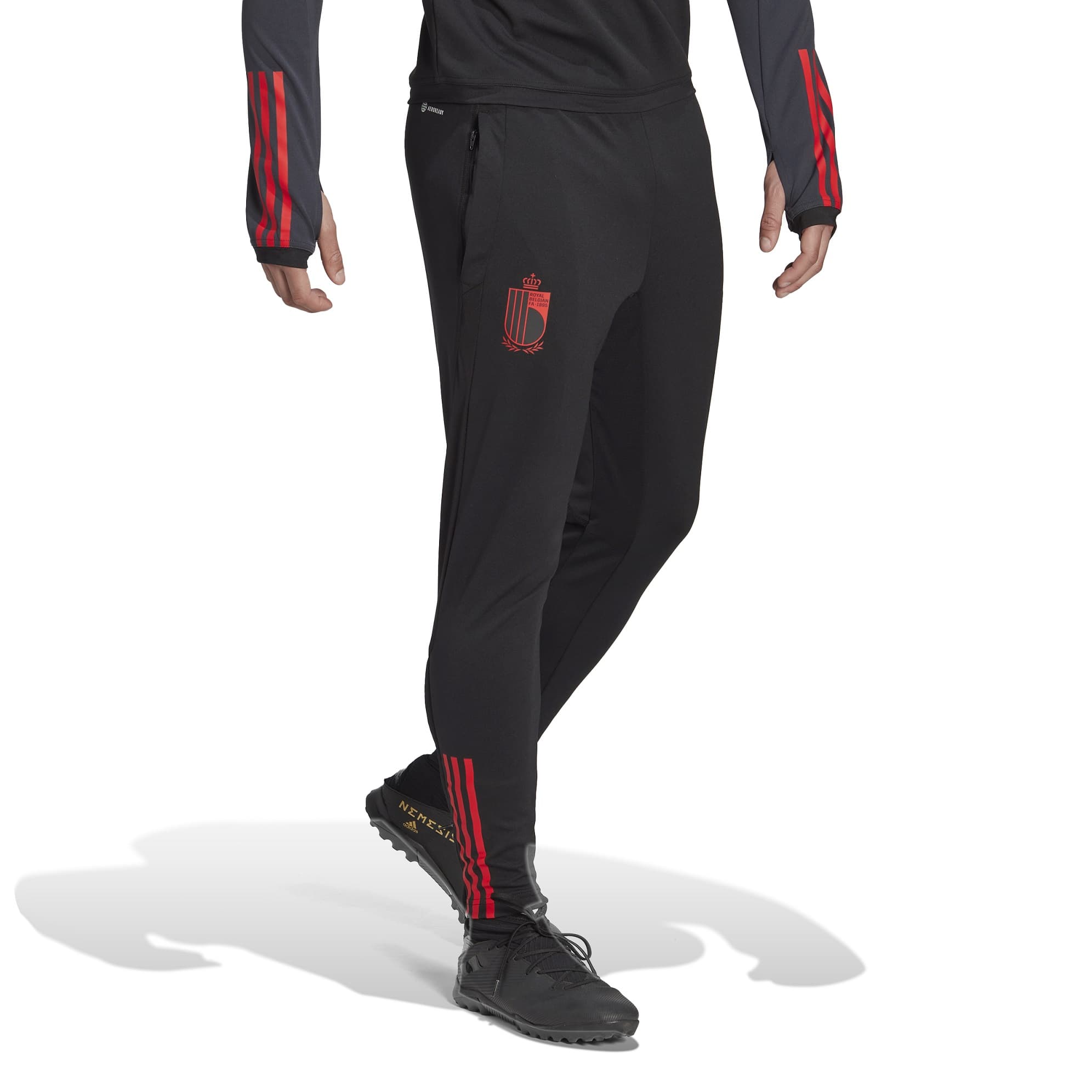 BELGIUM TRAINING BLACK PANTS 2022-23 - Image 1"Hit the training ground during cold mornings in these adidas football pants. They have a slim fit that hugs the body and breathable mesh panels to keep you comfortable as you move. AEROREADY ensures you stay dry when you run laps around the pitch or lace a shot on goal from distance. The Belgium crest shows your love for the national team. Made with 100% recycled materials, this product represents just one of our solutions to help end plastic waste."
