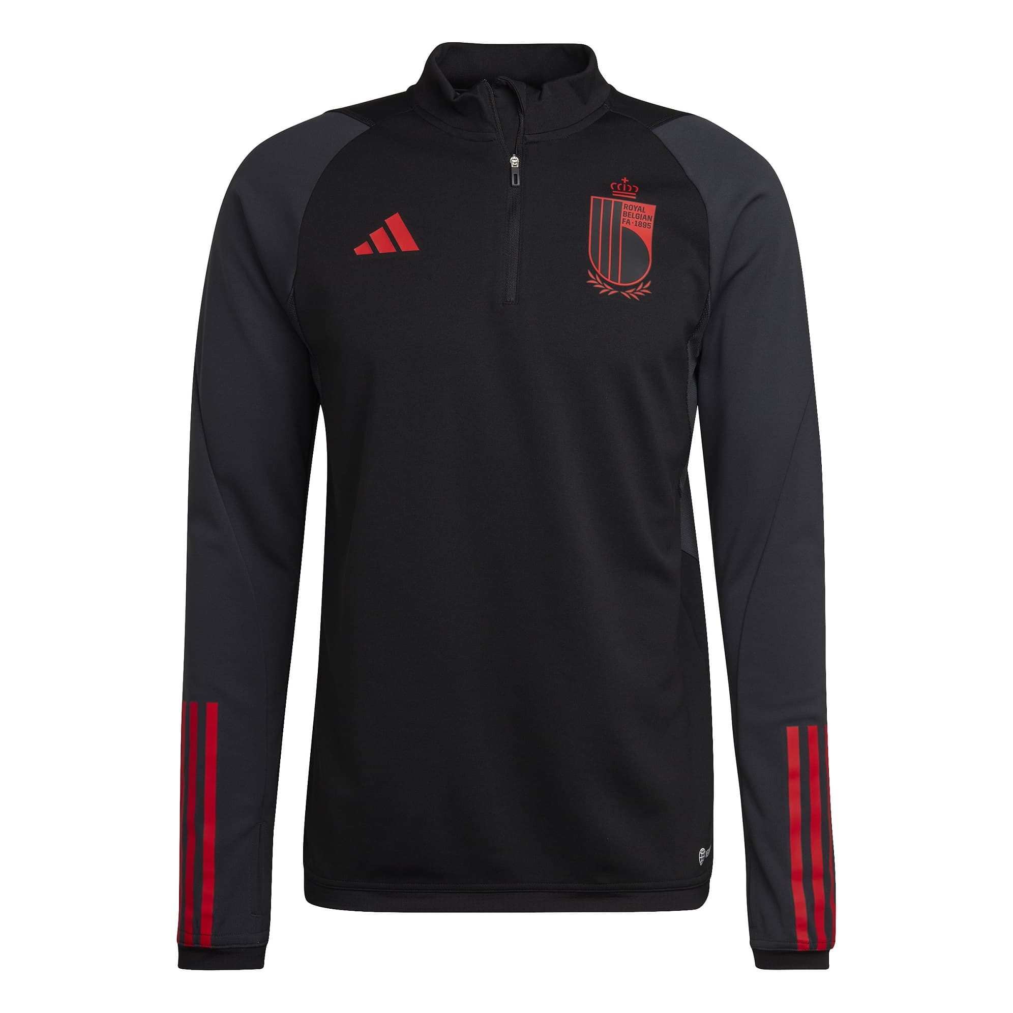 BELGIUM TRAINING DRILL BLACK TOP 2022-23 - Image 1"Don't let those chilly days get in the way of your training. This adidas training top flashes the Belgium football crest to show your love for the national team. It has a slim fit that hugs the body comfortably from the moment you put it on. Breathable mesh inserts on the sides combine with AEROREADY to keep you dry as you work through passing drills and early morning sprints. Made with 100% recycled materials, this product represents just one of our solutions to help end plastic waste."