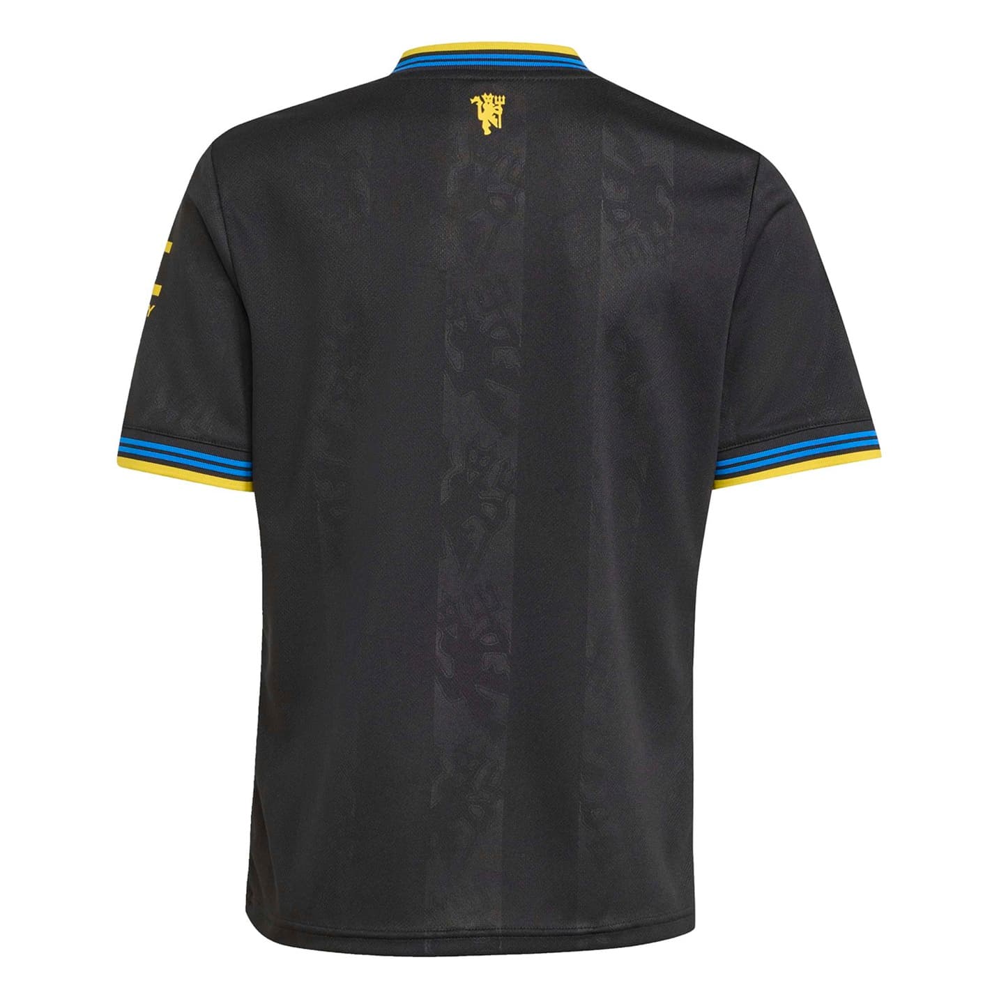 MANCHESTER UNITED 3RD JUNIOR SHIRT 2025-26 - Image 1Part of a clean, classic adidas kit that will transport fans to a golden era. Finished in black, this juniors' Manchester United third jersey conjures some of the club's most iconic players and memorable away performances. A yellow Trefoil and club badge stand out on the chest while more subtle, devilish details are woven into the fabric. Moisture-managing AEROREADY keeps young fans comfortable while their team create new memories.