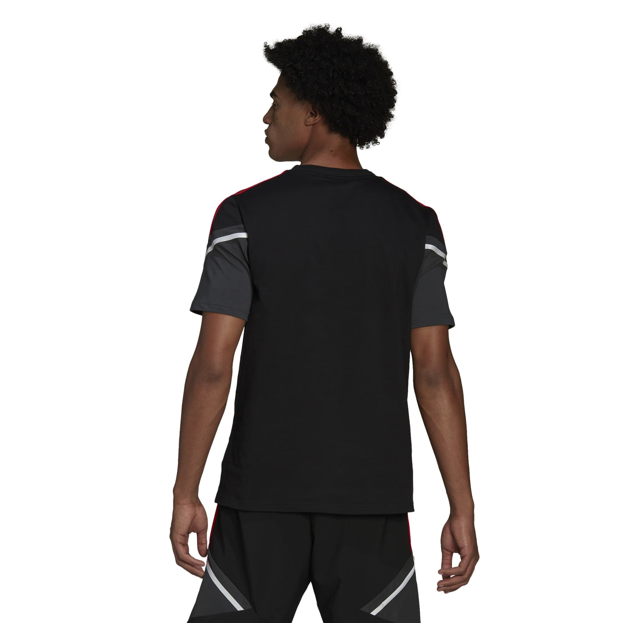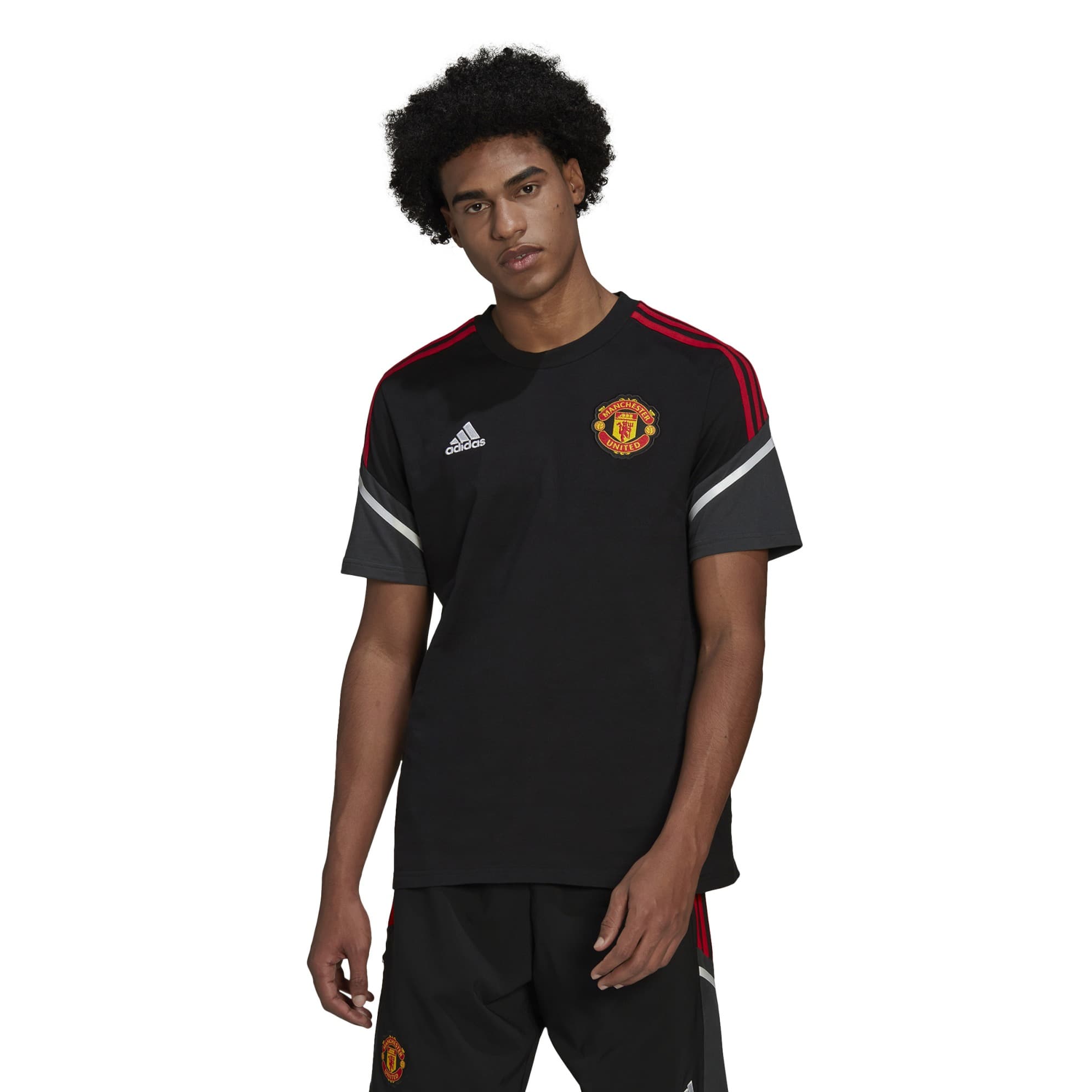 MANCHESTER UNITED BLACK T-SHIRT 2022-23 - Image 1Modern football is all about movement. So is Manchester United's Condivo 22 training kit. This adidas tee will keep you comfortable with soft single jersey fabric. A embroidered crest shares your pride. Our cotton products support more sustainable cotton farming. 100% cotton