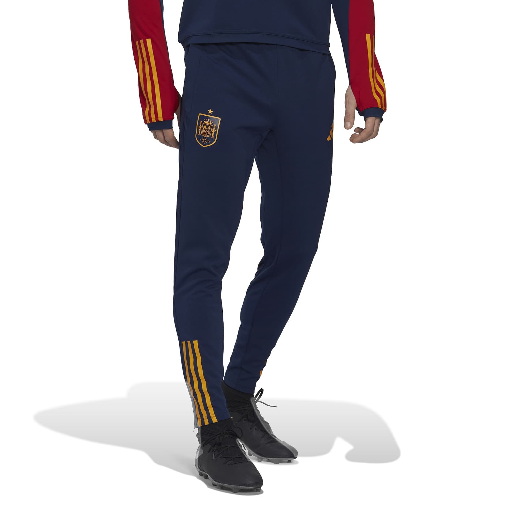 SPAIN TRAINING PANTS 2022-23 - Image 1"Powered by the belief of a nation. Spain players push their limits in training with the help of these adidas football pants. Their slim fit provides a streamlined silhouette on the pitch, but the ankle zips mean they're easy to get on and off in the changing rooms. Moisture-absorbing AEROREADY and breathable mesh details make them the perfect layer to wear when the action heats up. Made with 100% recycled materials, this product represents just one of our solutions to help end plastic waste."