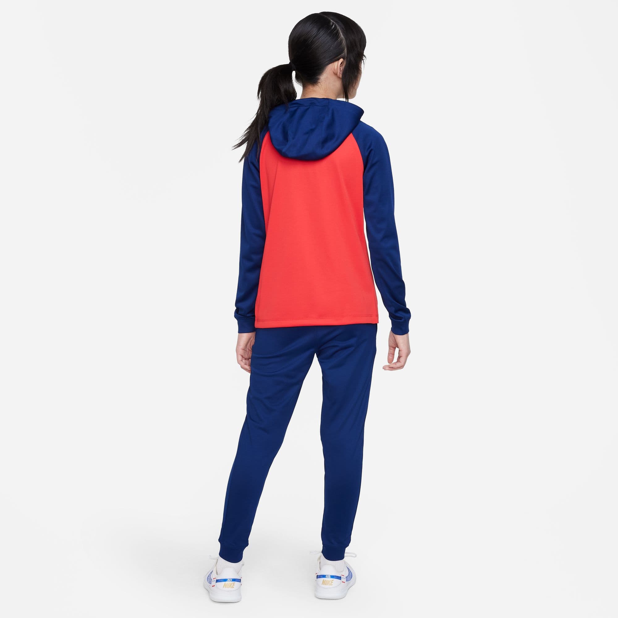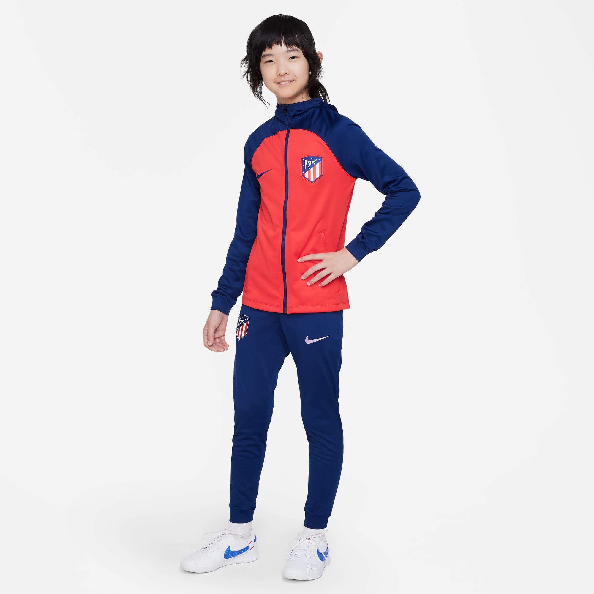 ATLETICO MADRID TUTA BAMBINO 2023-24 - Immagine 1Atlético Madrid Strike Big Kids' Nike Dri-FIT Hooded Soccer Tracksuit Questo capo è arricchito da dettagli di design specificamente pensati per le stelle nascenti del calcio. Il fit confortevole e il tessuto traspirante donano una freschezza ideale per consentirti di affinare le tue abilità con la massima concentrazione. La tecnologia Nike Dri-FIT allontana il sudore per favorirne una rapida evaporazione e mantenere la pelle asciutta per un comfort eccellente. Il leggero tessuto in maglia offre un fit morbido e liscio. Bordi a costine Tasche anteriori Zip anteriore a tutta lunghezza sulla giacca Pantaloni con elastico e coulisse in vita 100% poliestere