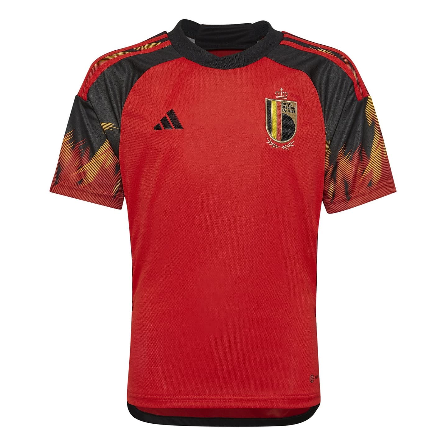 BELGIO MAGLIA BAMBINO HOME 2022-23 - Immagine 1"Una passione bruciante. Le fiamme arancioni infiammano le maniche nere di questa versione junior della maglia home del Belgio in omaggio al soprannome dei giocatori della squadra belga, Diavoli Rossi. Creata per mantenere la pelle asciutta anche quando l'atmosfera in campo si scalda, è dotata di tecnologia antiumidità AEROREADY e inserti in mesh. Il 3 Bar Logo e una versione in tessuto dello stemma del Belgio completano il look sul petto. Realizzato integralmente con materiali riciclati, questo prodotto è solo una delle nostre azioni concrete per contrastare l'inquinamento causato dai rifiuti plastici."