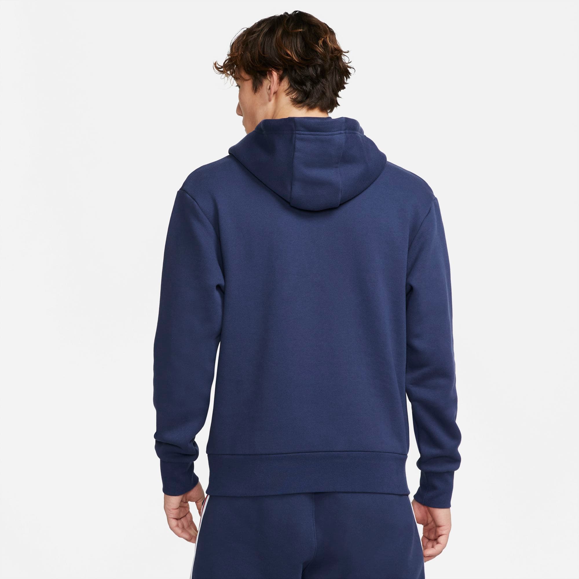 PSG FELPA CAPPUCCIO BLU JORDAN 2021-22 - Immagine 1COMFORT TOTALE E GRINTOSO TOCCO PARIGINO. Celebra la rivoluzionaria partnership tra il brand Jordan e il club calcistico del Paris Saint-Germain con questa felpa con cappuccio. Realizzata in fleece pesante e morbido, offre tutto il comfort di una maglia con uno stile casual. La grafica stampata e la targhetta cucita mettono in risalto la collaborazione. Jordan x Paris Saint-Germain La partnership tra il brand Jordan e il Paris Saint-Germain affonda le radici nello sport e si riflette nella cultura. Lo stile grintoso di Jumpman si abbina perfettamente al tocco sofisticato della moda parigina, aggiornando lo stile sportswear ed esponendo entrambi i marchi a un nuovo pubblico. Fleece pesante spazzolato Il pesante tessuto in fleece è spazzolato all'interno per un comfort e una morbidezza ideali. Il cappuccio è foderato con uno strato dello stesso morbido tessuto, per uno spessore e un comfort extra. Esclusivi dettagli Paris Lo stemma stampato Paris Saint-Germain x Jumpman e la targhetta cucita evidenziano questa collaborazione. La coulisse con punte in metallo e gli occhielli sfoggiano i dettagli dei brand Jordan e Paris Saint-Germain. More Details Standard fit Jordan Polsini e bordo del girovita in tessuto a costine elasticizzato Tasca a marsupio Grafica stampata Targhetta cucita Scritta "ICI C'EST PARIS" (Parigi è qui) stampata sull'apertura del cappuccio Corpo/Fodera cappuccio: 82% cotone/18% poliestere. Costine: 97% cotone/3% spandex.