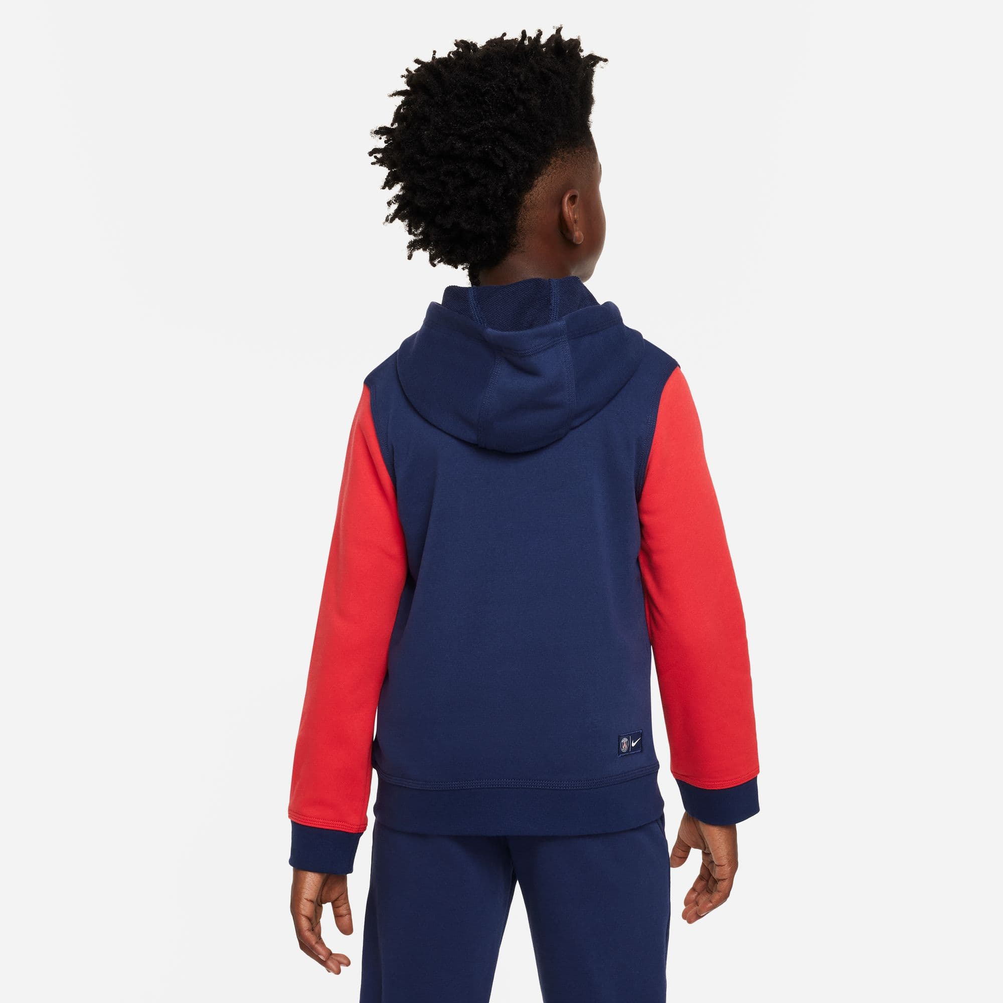 PSG FELPA CAPPUCCIO ZIP BLU-ROSSA 2023-24 - Immagine 1Paris Saint-Germain Club Big Kids' (Boys') Nike Soccer Full-Zip French Terry Hoodie Soft, warm and comfy—this PSG hoodie has you covered in chilly weather. French terry fabric in a relaxed fit goes on easily over your other clothes, while a team crest at the chest shows your devotion to your favorite squad. French terry fabric has a soft feel for lightweight comfort—like your classic sweatshirt. Ribbed cuffs and hem help keep the hoodie in place while you move. Front pockets Body: 80% cotton/20% polyester. Rib: 97% cotton/3% spandex.