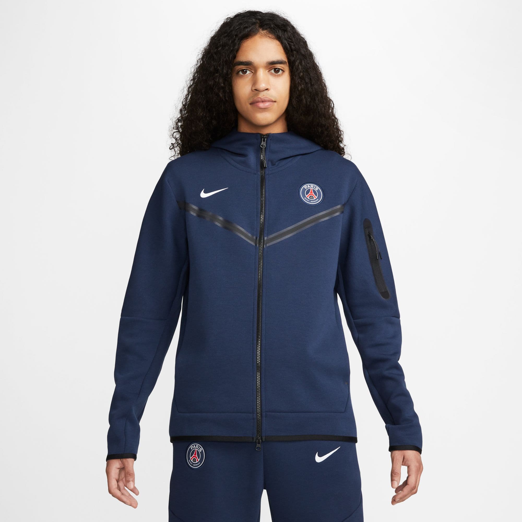 PSG FELPA TECH FLEECE BLU 2022-23 - Immagine 1Paris Saint-Germain Tech Fleece Windrunner Men's Full-Zip Hoodie LA GIACCA DA RUNNING ORIGINALE, AGGIORNATA. La felpa con cappuccio Paris Saint-Germain Tech Fleece Windrunner rinnova una silhouette iconica con il calore e la leggerezza del tessuto Nike Tech Fleece. Con i colori e lo stemma della squadra, potrai fare il tifo per il PSG anche quando fa freddo. Il calore del fleece Il tessuto Nike Tech Fleece offre calore e leggerezza ideali. Il cappuccio offre copertura dal maltempo. Ampio spazio per i tuoi oggetti Le tasche frontali e una tasca con zip sulla manica sono ideali per riporre i tuoi oggetti indispensabili quando sei in movimento. Passione parigina Lo stemma e i colori della squadra ti permettono di mostrare la tua passione per il PSG. More Details Standard fit per uno stile confortevole Corpo: 66% cotone/34% poliestere. Interno tasche: 100% cotone. Fodera cappuccio: 69% cotone/31% poliestere.